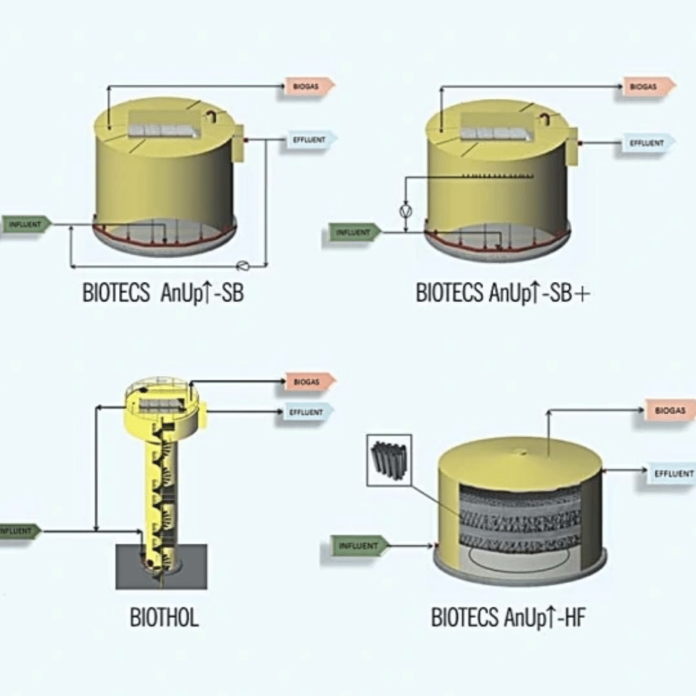 A BIOTECS possui diferentes e inúmeros tipos de reatores em seu portfólio de tecnologias anaeróbias, que são selecionados em função das características do resíduo líquido poluente e propósitos finais.