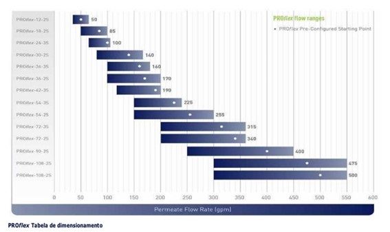 O PROflex é composto por 15 configurações primárias diferentes, centradas em mais pontos de fluxo do que o PRO RO convencional. Cada uma das 15 configurações e fluxos resultantes podem ser modificados para alterar o tamanho da bomba antes de configurar outras opções e acessórios. Isso permite que você projete um sistema RO que atenda de perto a vazão de permeado desejado e demanda de água requerida em volume e qualidade.