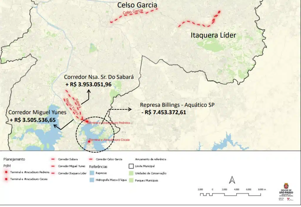 Como se pode ver no mapa abaixo, tanto o corredor Nossa Senhora do Sabará, quanto o Miguel Yunes, desembocam na Pedreira, um dos polos da represa que será local de embarque e desembarque da travessia para Cocaia.