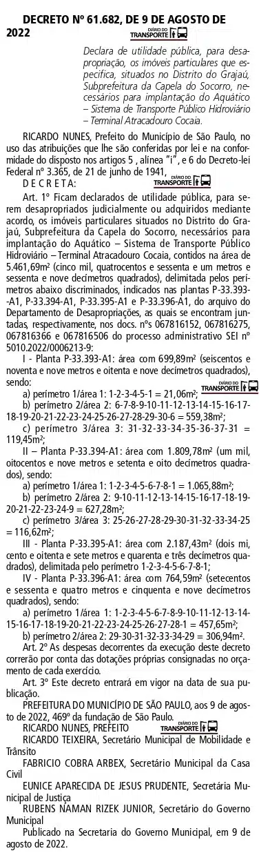 Na edição do Diário Oficial de 08 de julho de 2022, o prefeito Ricardo Nunes publicou dois decretos de utilidade pública de imóveis particulares, passo que antecede as medidas legais de desapropriação das áreas, necessárias à implantação dos equipamentos do transporte coletivo.