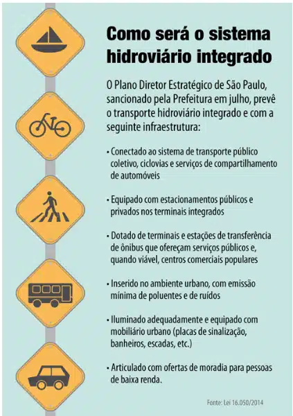 Aprovada e depois promulgada no mês de junho daquele ano, a Lei 16.010/2014 determina integrar o transporte por rios e represas da cidade ao sistema de transporte por ônibus e trilhos, tudo pago com o Bilhete Único. Pela Lei, os portos estarão integrados ao sistema de ônibus, metrôs e trens.