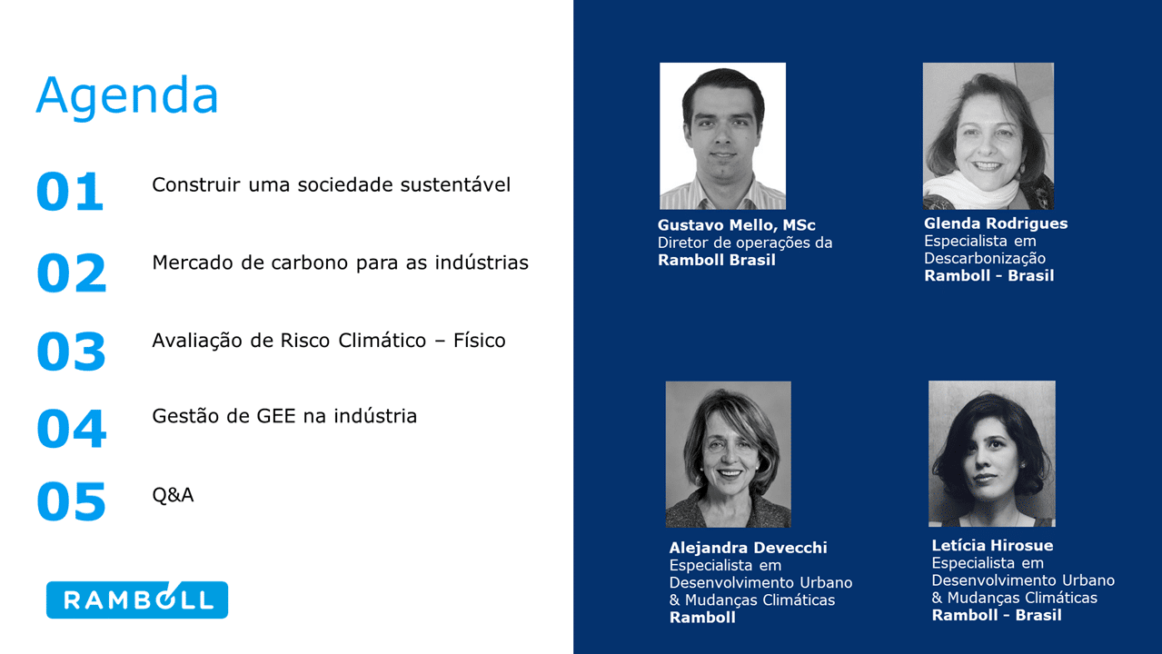 Especialistas da Ramboll Group irão compartilhar as etapas para o diagnóstico de impactos climáticos a serem aplicadas aos seus negócios, visando a elaboração de um plano de ação com as medidas necessárias de mitigação e adaptação.