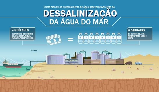 De acordo com informações coletadas de prestadores de serviços em vários países da América Latina, estima-se que o preço médio por metro cúbico de água dessalinizada para uso residencial é de US$ 0,61. Considerando o consumo médio na região de 6,1 m³ por pessoa por mês, o engenheiro calcula que o custo mensal de abastecimento de água potável da dessalinização da água do mar seria de US$ 7,4 dólares por pessoa, excluindo diferenças de bombeamento e transporte. “O custo mensal seria o equivalente a comprar quatro garrafas de 5 litros de água mineral de uma marca de consumo regular no Brasil”, destaca.