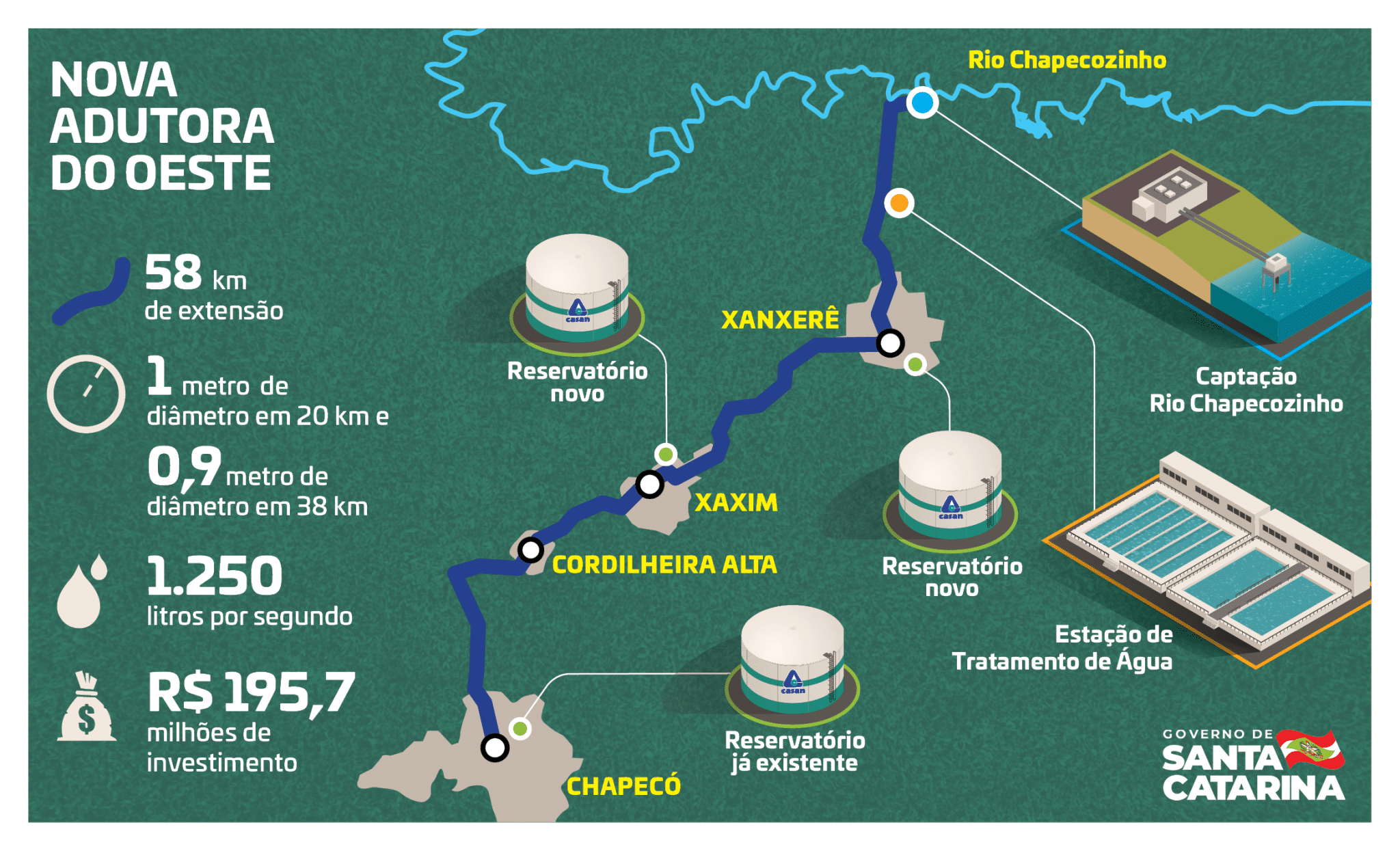 Ao todo, o projeto prevê a construção dessa grande ETA com capacidade de produção de 1,2 mil litros por segundo, e quatro reservatórios de grande porte, proporcionando uma capacidade total de reserva de 17,5 milhões de litros e maior segurança hídrica para Xanxerê, Xaxim, Cordilheira Alta e Chapecó.