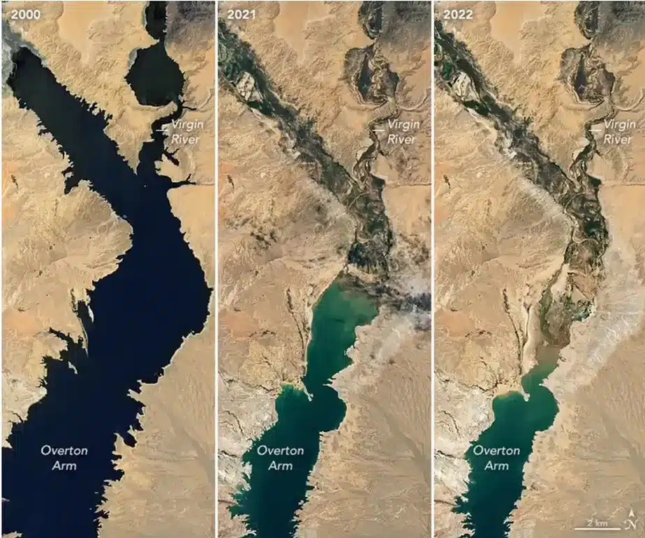 A foto, que faz um comparativo com o cenário nos anos 2000, 2021 e 2022, impressiona. O Lago Medow, que fornece água para cerca de 25 milhões de pessoas em todo o oeste americano, está hoje no nível mais baixo desde que foi enchido, em 1937. Na medição feita no dia 18 de julho, possuia apenas 27% de sua capacidade.