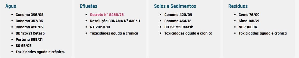 Análises físico-químicas e bacteriológicas de água tratada Monitoramento de águas subterrâneas e superficiais Avaliação de efluentes industriais e sanitários Determinação de cianeto, sulfeto, metais pesados e compostos orgânicos Controle de condutividade da água.