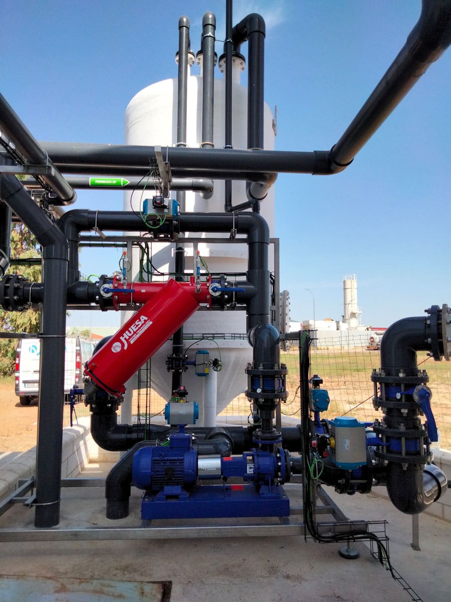 Para poder lavar a planta quando ela for desligada, um tanque de GRP truncado em forma de cone de 5 m3 foi incluído no sistema, a partir do qual a bomba de alimentação suga a água ultrafiltrada e a introduz na planta. O restante do permeado é coletado em dois tanques GRP de 40 m3 que coletam a água de entrada da linha de tratamento existente na fábrica.
