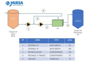 Pelas condições do processo e da água a ser tratada, além de ser o único sistema que garante o controle de incrustações e entupimentos das membranas, o tipo de UF a ser utilizado será um sistema de crossflow (fluxo cruzado) de dentro para fora com capacidade para produzir 15 m3/hora de permeado.