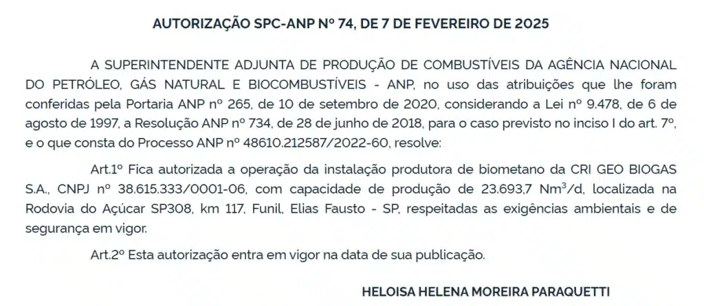 - Art.1º Fica autorizada a operação da instalação produtora de biometano da CRI GEO BIOGAS S.A., CNPJ nº 38.615.333/0001-06, com capacidade de produção de 23.693,7 Nm³/d, localizada na Rodovia do Açúcar SP308, km 117, Funil, Elias Fausto – SP, respeitadas as exigências ambientais e de segurança em vigor.
