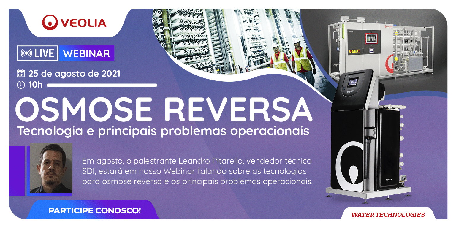 Em 25 de Agosto de 2021, às 10h, a Veolia Water Technologies, líder mundial em tratamento de água, promoverá um webinar voltado para Osmose Reversa, com o objetivo de apresentar as tecnologias e principais problemas operacionais.