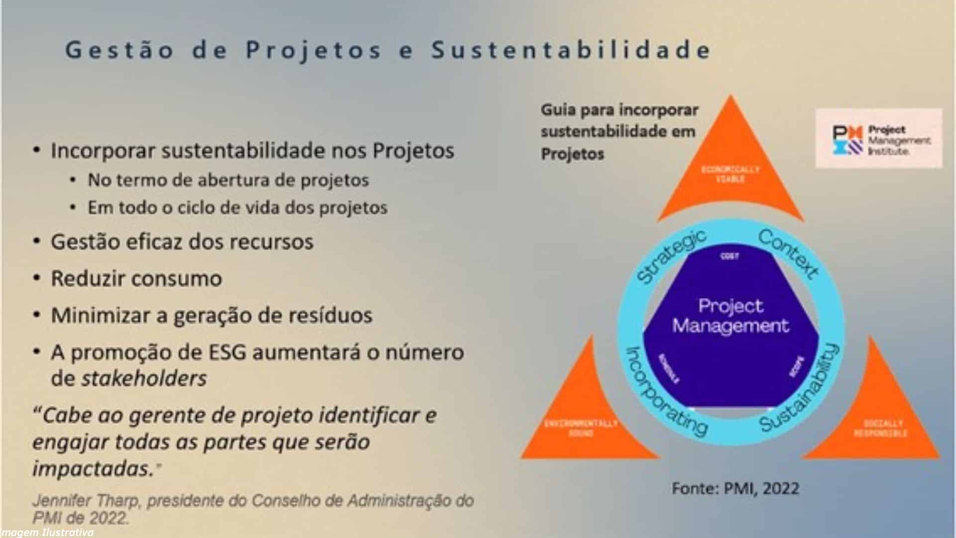 Assunto importante, também mencionado foi sobre a temática ESG que já está incorporada no PMI com o Guia para incorporar sustentabilidade em projetos, no termo de abertura de projetos, em todo o seu ciclo de vida.