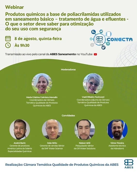 Marque na agenda: dia 8 de agosto, teremos o webinar “Produtos químicos a base de poliacrilamidas utilizados em saneamento básico – tratamento de água e efluentes – O que o setor deve saber para otimização do seu uso com segurança”.